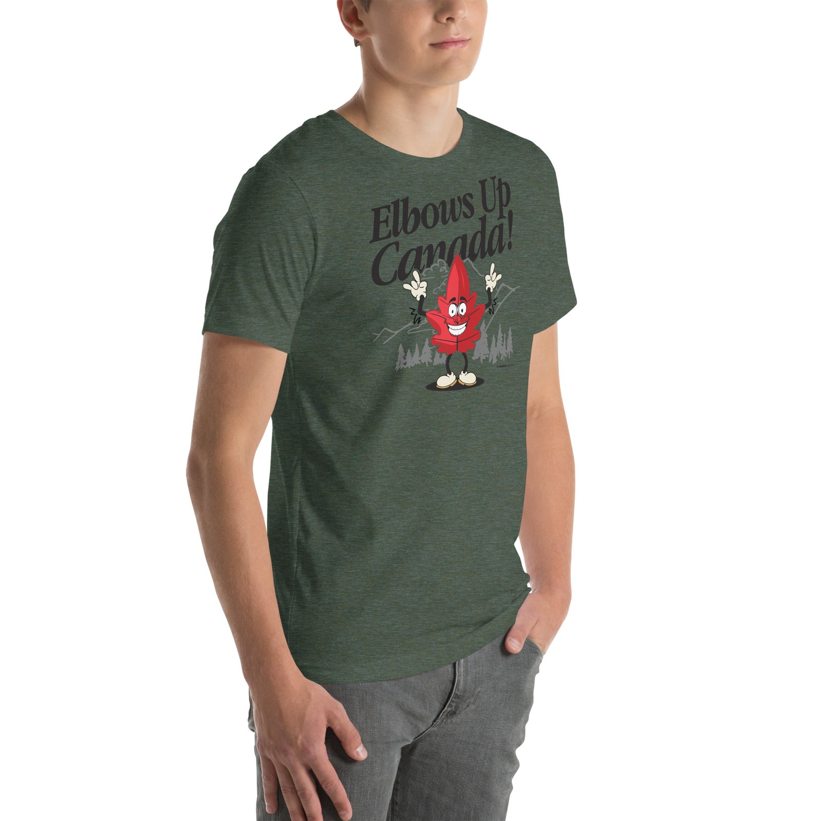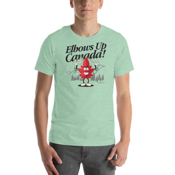 The “Elbows Up Canada!” solidarity slogan with our Maple Leaf Mascot is printed on the Bella + Canvas 3001. It is soft and lightweight with the right amount of stretch, so it’s comfortable and flattering for all.